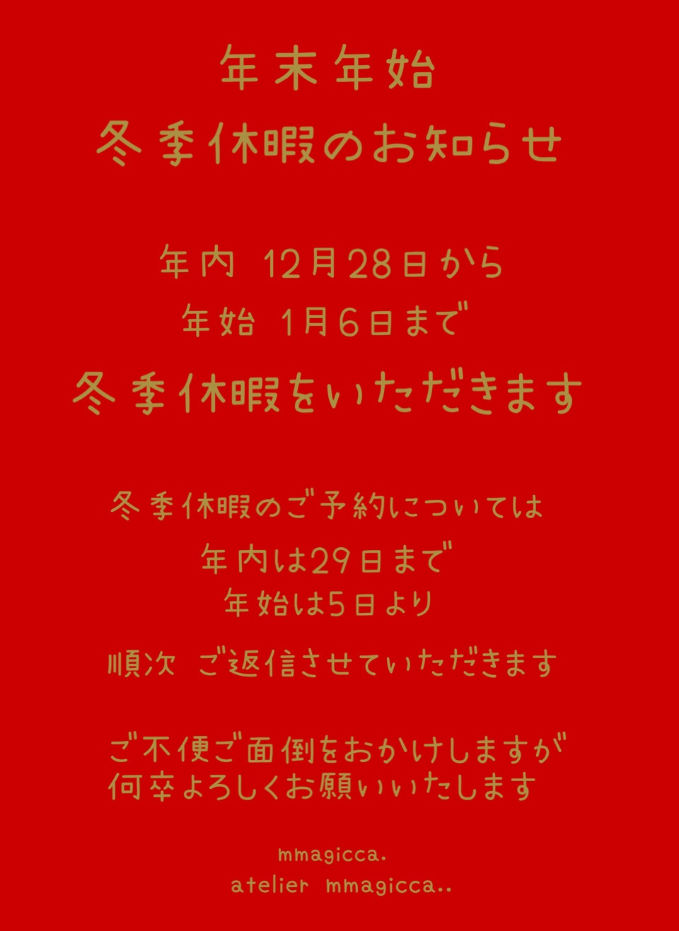 年内 28(日) 〜 年始 1/6(火) まで 冬季休暇 をいただきます
